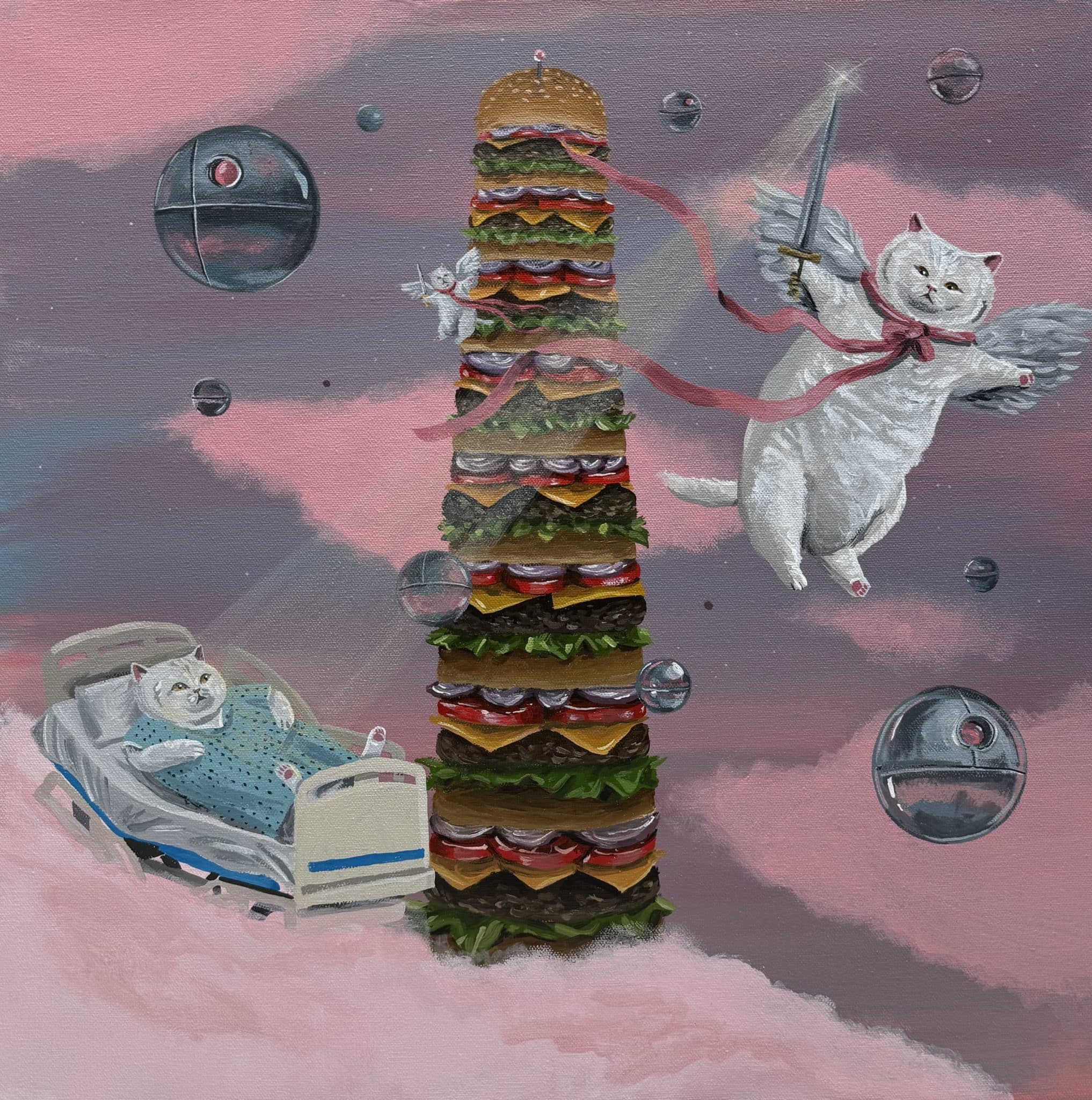 His work draws on the visual language of memes, internet cat content, and mass-produced decorative art to explore existential themes of mortality, absurdity, and the influence of technology on the human psyche. Ryan’s remarkably prolific artistic practice offers a unique perspective on the complexities of contemporary life and the challenges of maintaining mental health, depicting cats navigating the unpredictable and often chaotic experiences of being human.