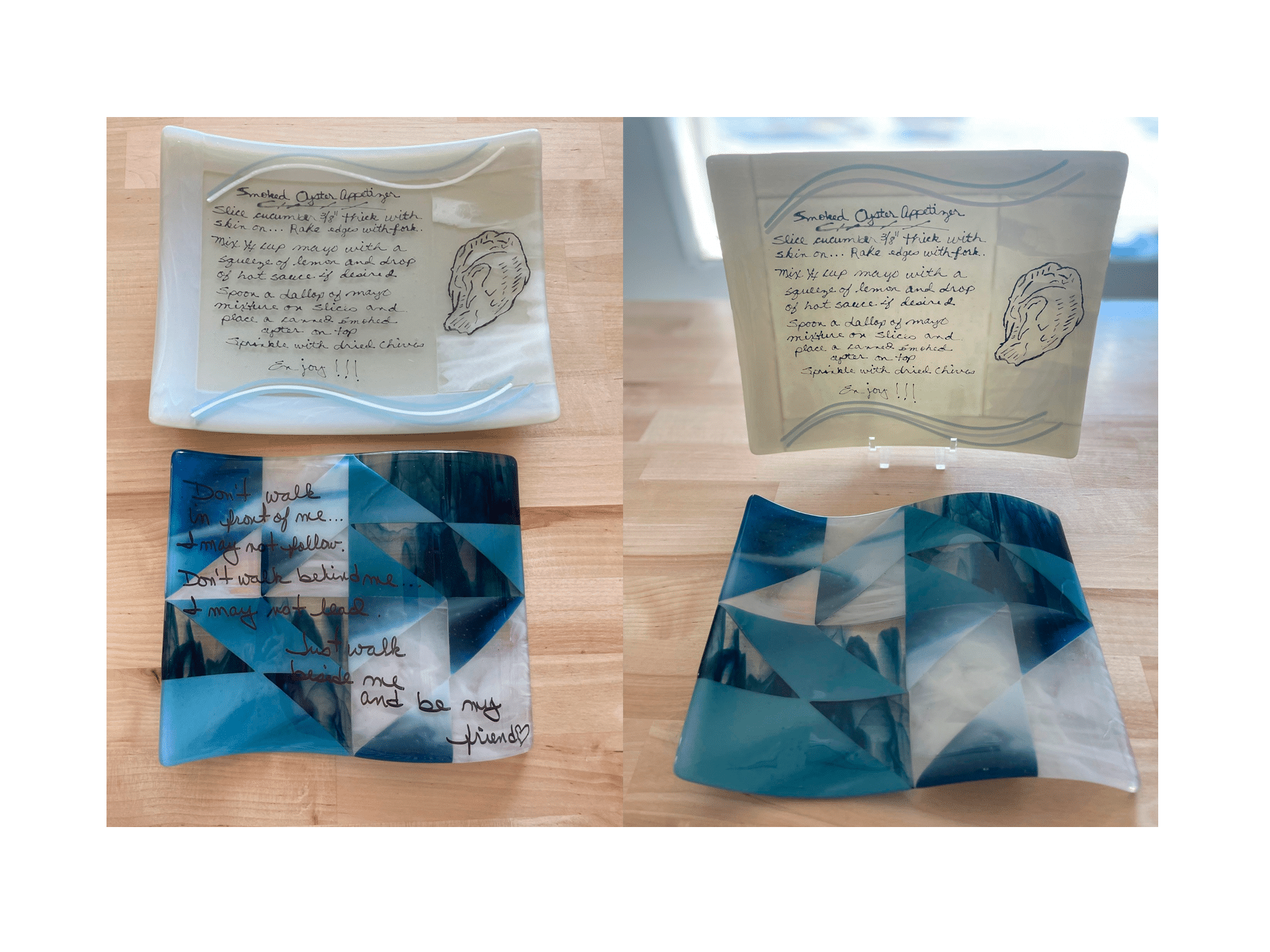 Create a beautiful Recipe Plate or Spoon Rest in fused glass. Students will learn the basics of glass fusion to design and create a one of a kind functional piece of glass art. Bring a special -short- Recipe in your handwriting to copy on glass with Glassline paints. Overall glass size will be 7″ x 9″